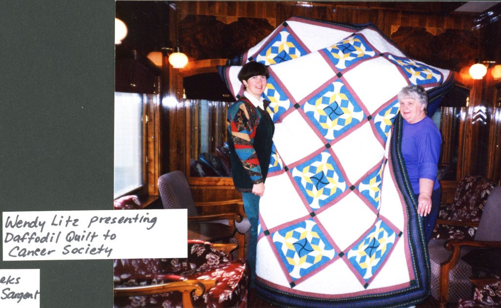 One year the guild was approached by a family of a young mother who died of cancer. Members finished quilts she had started for her children. Her husband gave the guild $200 as a thank you, and with this money, the members made a “daffodil” quilt in the mum’s memory for the local Cancer Society to raffle. This event seems to be the first time the guild responded to a request from the community.