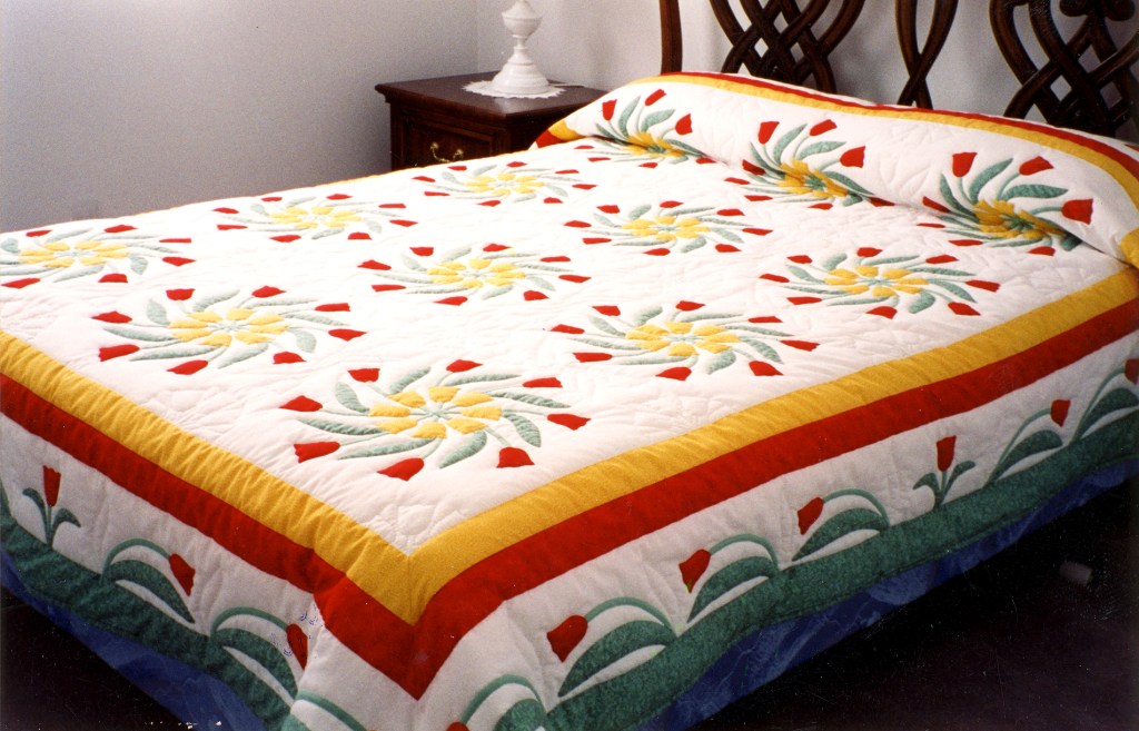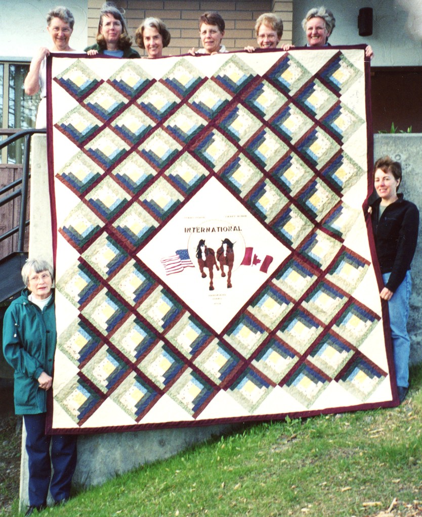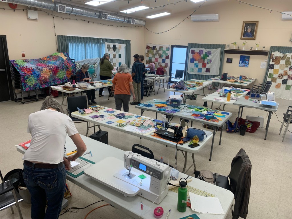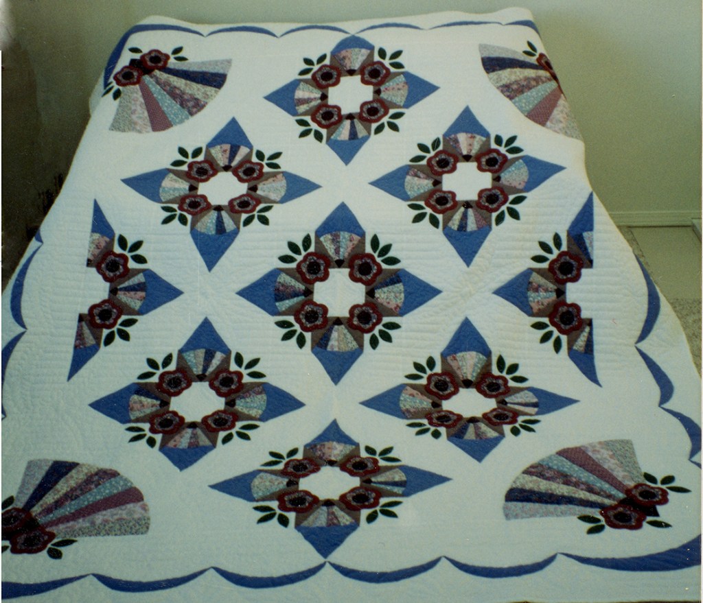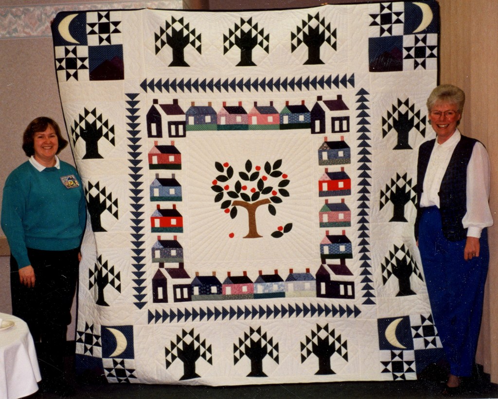 The guild was founded in 1985 by Lisa Sharpe and Dominique Drummond, who initially advertised for women interested in learning about quilting to form a guild. Since its inception, over 300 local women have joined as members. Today, in 2025, 60 ‘ordinary’ women, aged 30 to 94, gather twice a month from September to June to promote the guild’s objectives: preserving the art of quilting, sharing quilting skills within a community of women, and donating quilts to social and health agencies to give to those in need of the comfort a home-made quilt can bring.