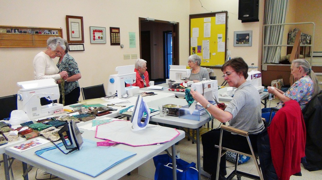 Gallery Below (left to right): Canadian Feminism –Wiki commons; Members playing a quilting game,“Strip Poker,” at a program night. Front table: L around – Betty Young, Ingrid Carlgren vs. Sandra Martin. Linda Wesley, Wendy Hogg; Background – Susan Little, Carol Patton, Mary Lindguist, Unknown and Ilene Lowing – All images courtesy of CQG.